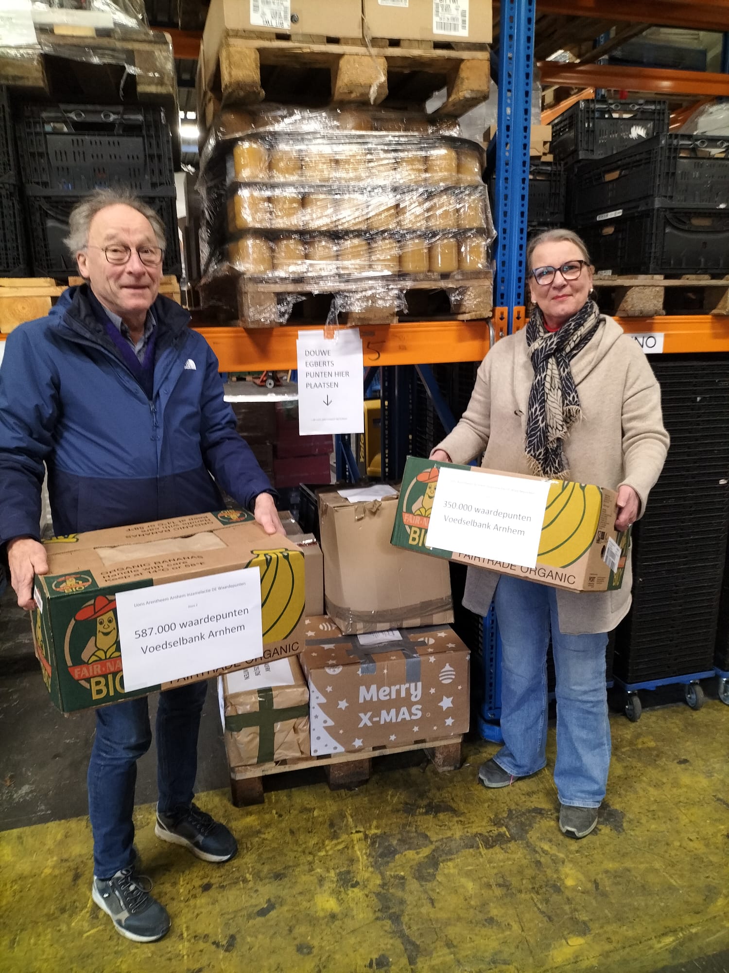 Vandaag zijn door Geert Jan, onze actiecoördinator binnen de club DE punten voor de Voedselbank Arnhem, 2 volle dozen met in totaal bijna 1 miljoen waardepunten overhandigd aan Anneke van de Voedselbank Arnhem e.o.